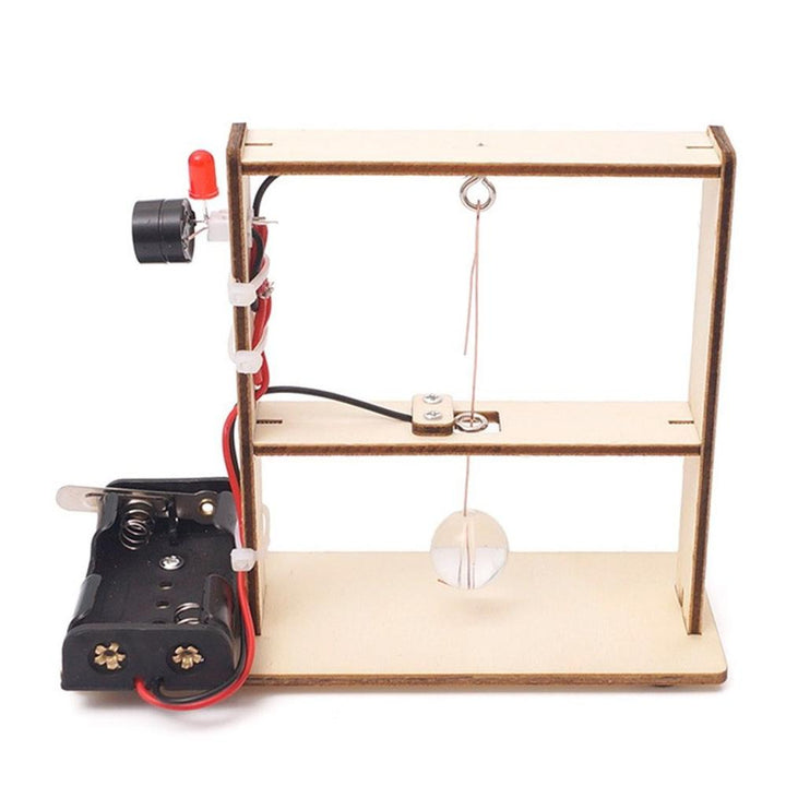 The Earthquake Alert Detector demonstrates how an earthquake sensor project works. When vibrations or seismic activity occur, the pendulum swings and makes contact with the metal ring. This completes the electrical circuit, activating the LED indicator and buzzer to signal movement. This simple mechanism clearly shows how motion can be converted into an electrical response, providing a real-world example of earthquake detection for your science exhibition project.