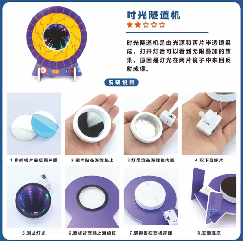 This item is a DIY time tunnel machine science experiment toy for kids, which utilizes an infinity mirror illusion. It's designed as an educational STEM kit to help children understand the concept of light reflection and optics through hands-on assembly.