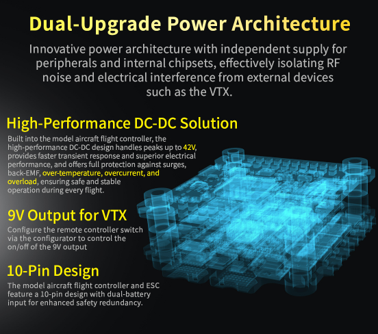 | Independent 9V BEC Output | 2 groups (1x 9V pad on front, 1x 9V output in a connector on the back). Total output current: 3A. Supports PINIO remote on/off control. |