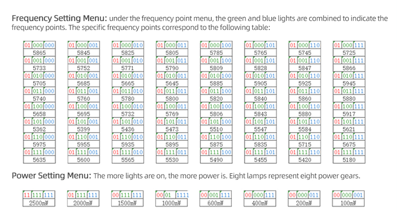Long press the button to switch the menu. The first two red lights indicate the menu. 01 represents the frequency menu. The frequency comparison table is as follows. 00 is the power menu. When switching to the power menu, the indicator light will display the current power in the form of a flowing light. The two red lights under the power menu will be reused to indicate the power (when it is greater than 1500mw) Under the current menu, press the button briefly to change the value. The button is only effective within one minute of startup. If it is not pressed for more than one minute, the button will be locked automatically to prevent interference from being triggered by mistake.