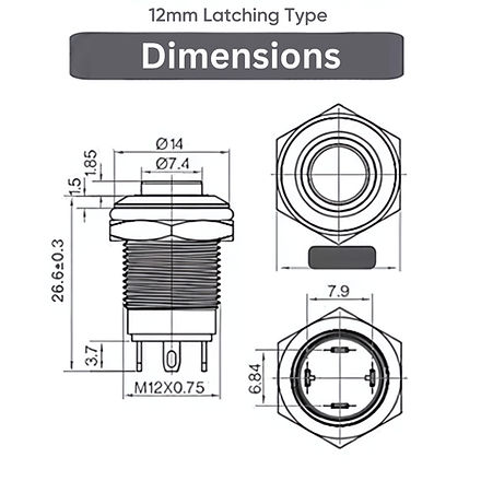 12mm Size BLUE Led Stainless Steel Latching Type Push Button Switch 12v DC