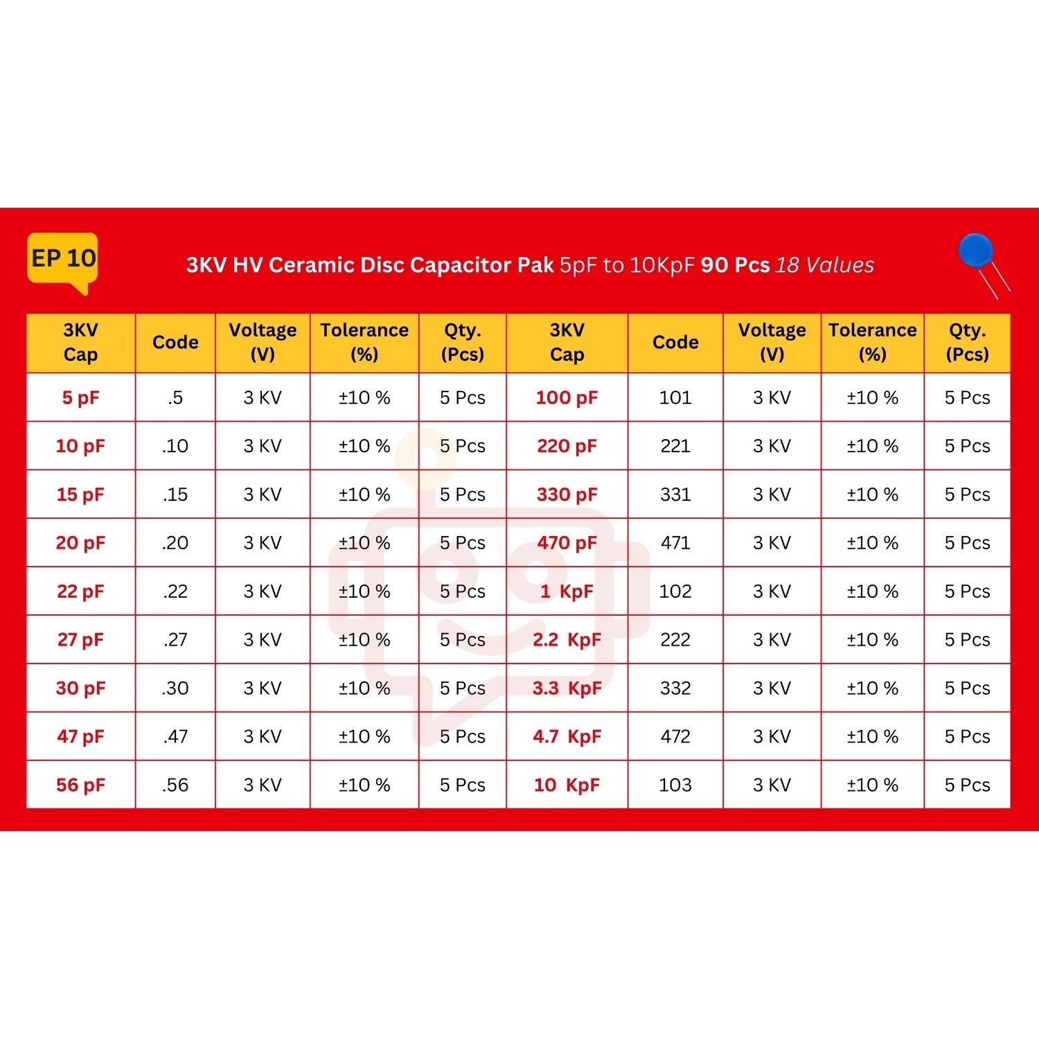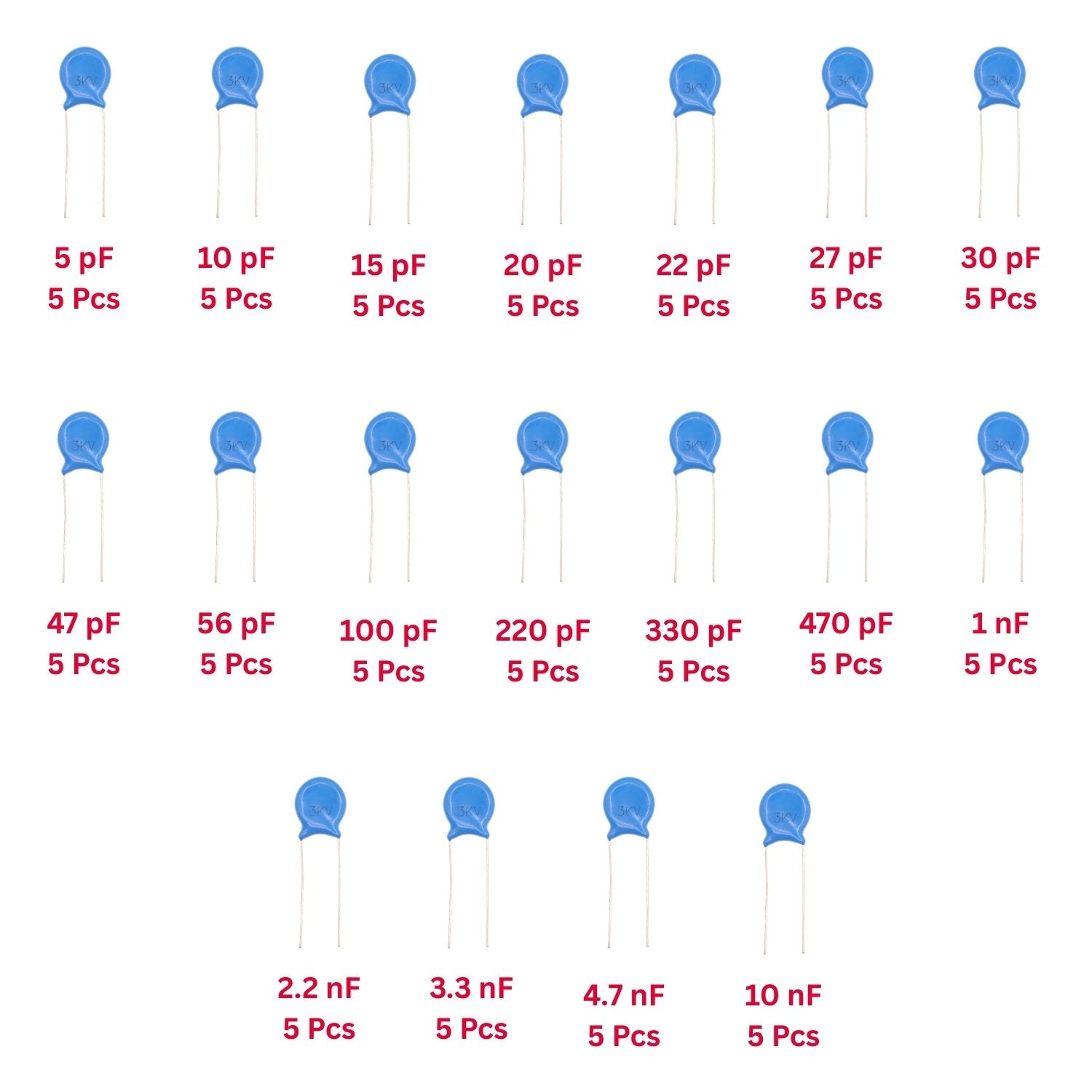 Elepak 3KV HV Ceramic Disc Capacitor Pak 5pF to 10KpF 90 Pcs 18 Values