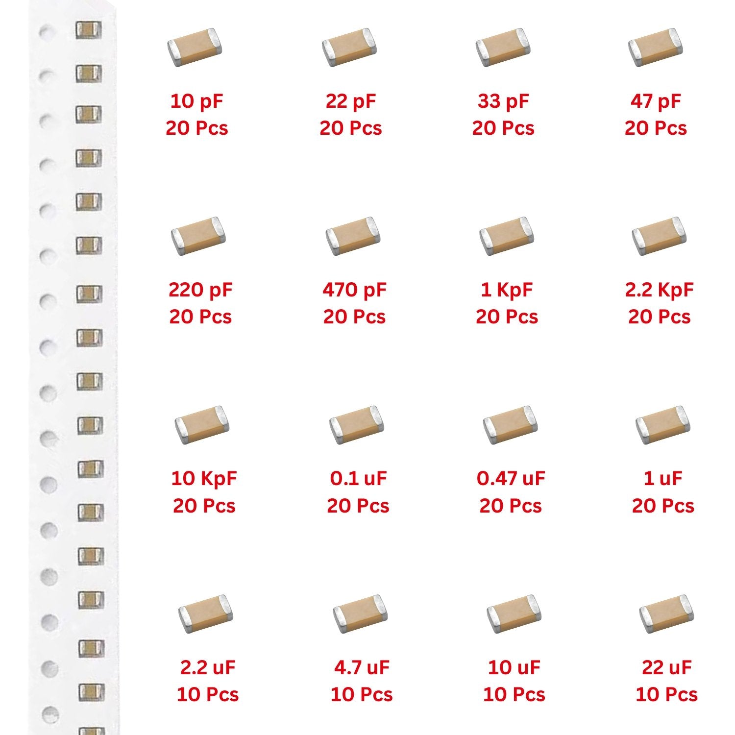 This pack consists of 280 pieces of 0603 SMD (Surface-Mount Device) capacitors in 16 different types, providing a variety of capacitance values, voltage ratings, and tolerances. It is designed for general-purpose use in a wide range of electronic applications, especially for prototyping, repair, or small-scale production. The capacitors come in a compact and organized package, with each type clearly marked and labelled for easy identification.