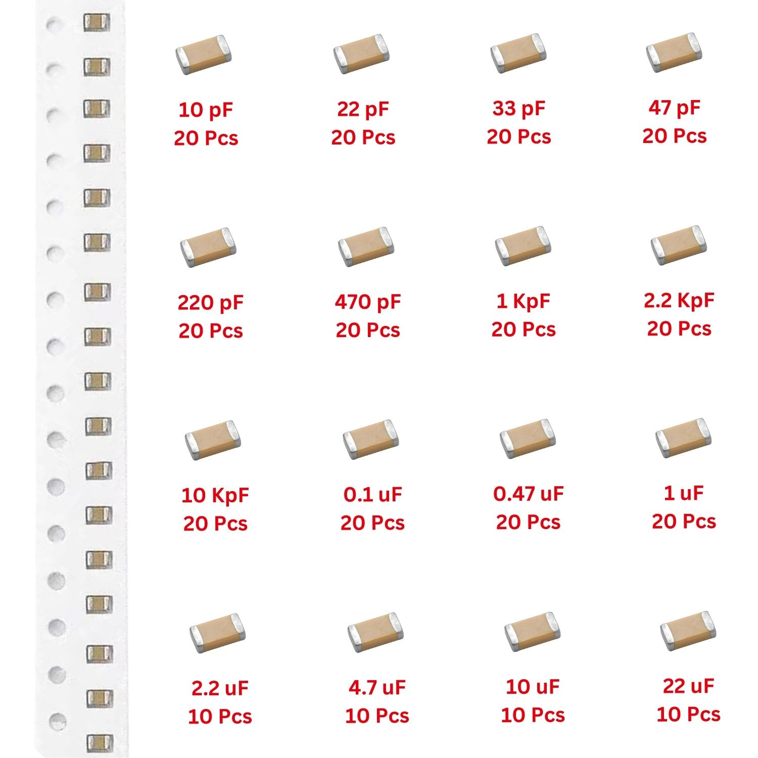 SMD 0805 Capacitors are small-sized surface-mount devices (SMD) with a package size of 0805, which is approximately 2.0mm x 1.25mm. They are widely used in electronic circuits for various purposes, such as decoupling, filtering, signal processing, and energy storage. These capacitors are typically made from ceramic materials and are commonly found in a wide range of consumer electronics, automotive electronics, telecommunications, and industrial devices.This 280-piece SMD 0805 capacitor assortment includes 16 different capacitance values with varying voltage ratings, making it an ideal selection for electronics prototyping, repair, and circuit design.