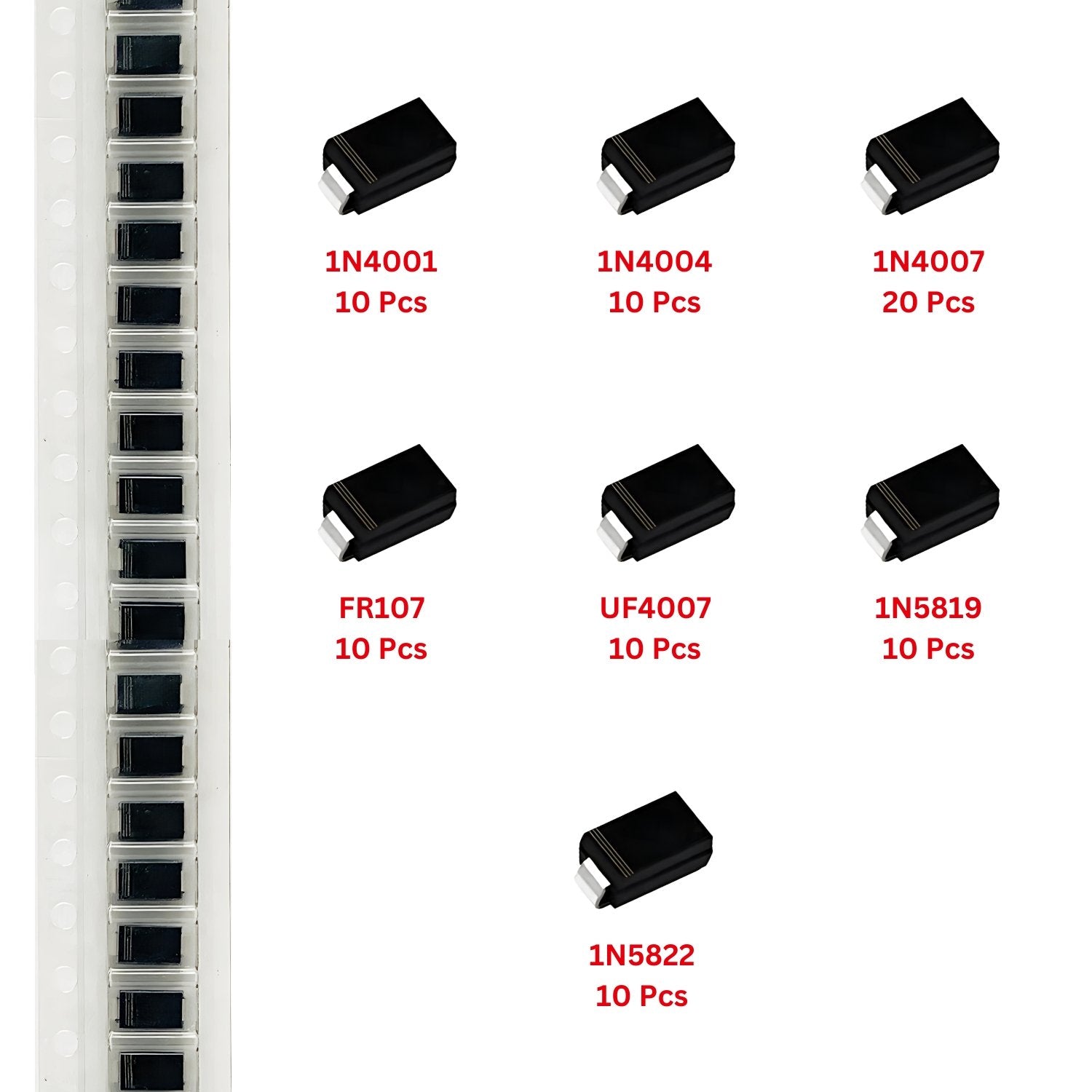 This assortment pack consists of 80 Surface-Mount Device (SMD) diodes, categorized into 7 different types, commonly used in rectification, fast recovery, and Schottky applications. These diodes are essential for various electronic circuits, including power supplies, voltage regulation, and signal protection.