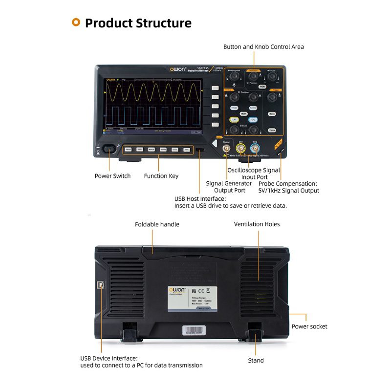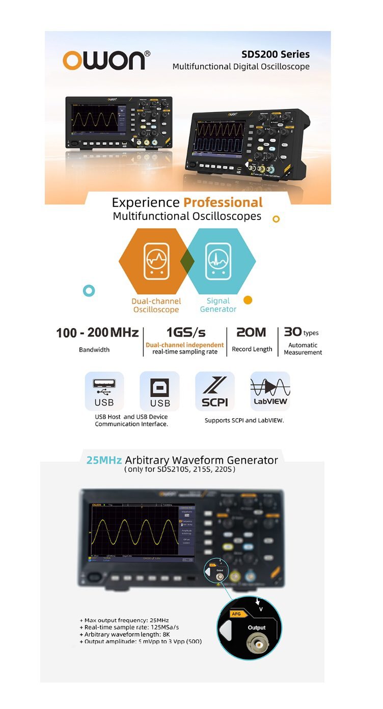 Owon SDS215S Digital oscilloscope 2 Channel 150MHz Bandwidth 1 GS/s Sample Rate with Built-in 1 CH 25MHz Waveform Generator