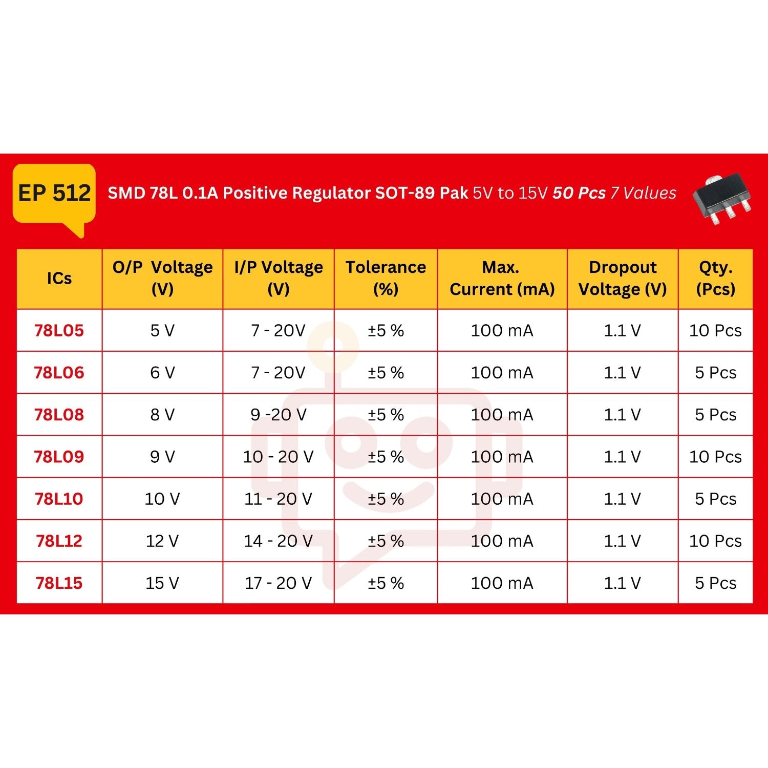 This is a set of 50 SMD (Surface-Mount Device) SOT-89 package positive voltage regulators in the 78Lxx series, offering 7 different types with various fixed output voltages. These regulators are designed to provide a stable and regulated output voltage from a higher input voltage source. They are ideal for low-power applications, typically providing output currents up to 100 mA, making them perfect for powering microcontrollers, sensors, and small electronics.