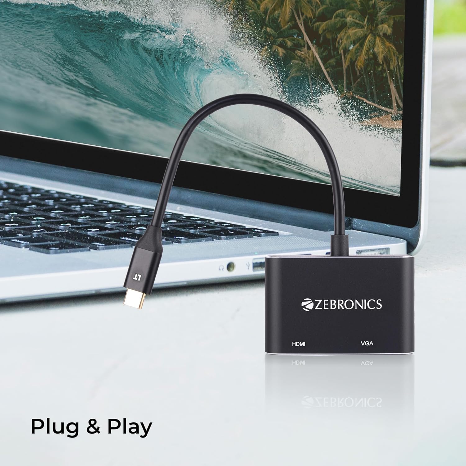 ZEBRONICS TA150HV Type C to HDMI & VGA Converter with 24K Gold-Plated Connector, Supports - FHD 1080p@60Hz (VGA), 4K@30Hz (HDMI), Audio Out Through HDMI,